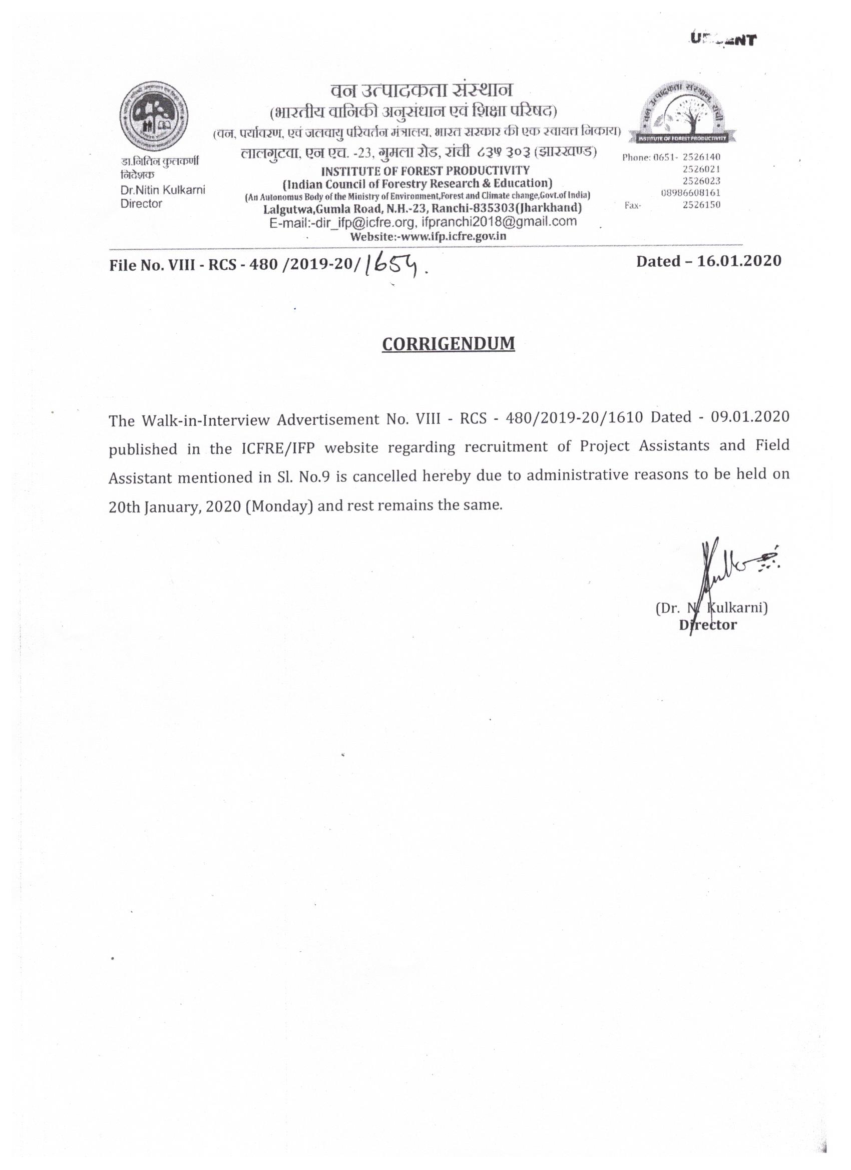 62 Corrigendum: Notification for walk in interview for the position of Junior Project Fellow and Field Assistant purely on contractual basis will be held on 15th April 2025 at 9:00 AM in the Covocation Hall of FRI Main Building, P.O New Forest FRI Dehradun अद्यतन - 04 Apr 2025 (0.31 MB)