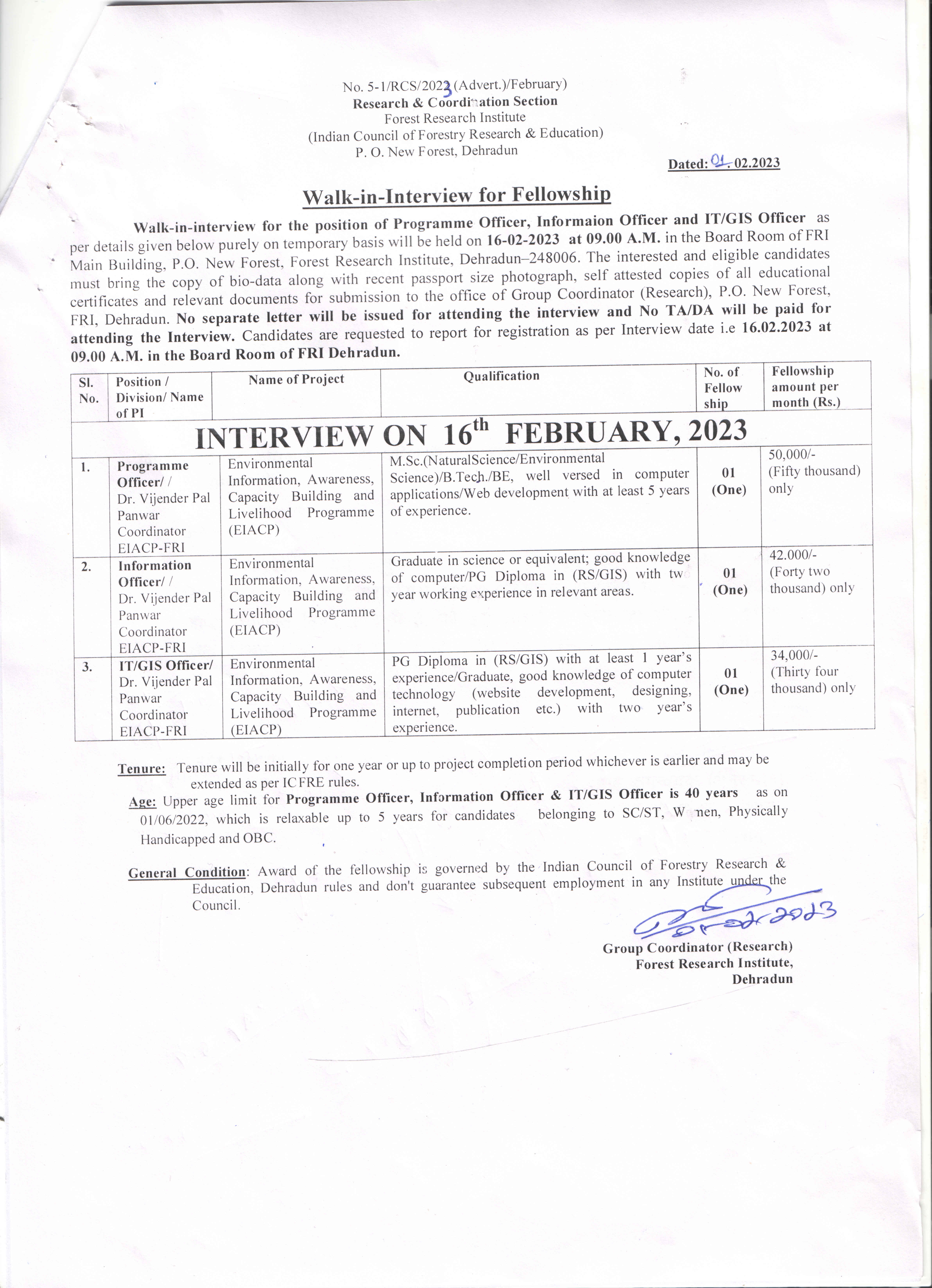 9 Notification for walk in interview for the position of Information Officer and Data Entry Operator purely on temporary basis to be held on 27th November 2025 at 9:00 AM in the Board Room of FRI Main Building, P.O New Forest FRI Dehradun अद्यतन - 20 Nov 2025 (1.16 MB)